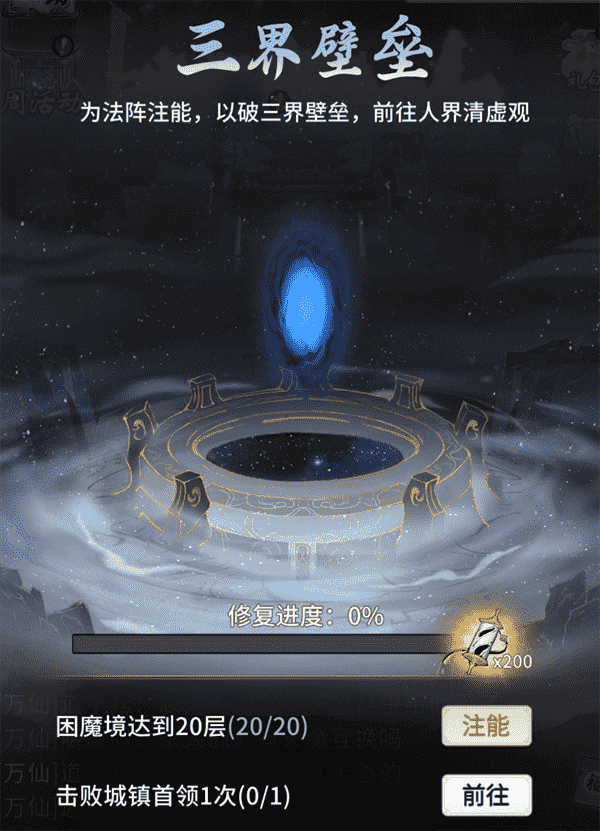 当你修为达到返虚/破虚中期后,,可在城镇寻得芸丫并激活神秘法阵,,,,通过收集材料、、、击败首领等方式为法阵注能,,,,借以打破三界壁垒,,,,开启支线剧情“清虚旧梦”